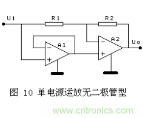圖9要求R1=R2,R4可以用來調(diào)節(jié)增益,增益等于1+R4/R2;如果R4=0,增益等于1;缺點是正負半波的輸入阻抗不相等,要求輸入信號的內(nèi)阻要小,否則輸出波形不對稱。