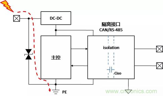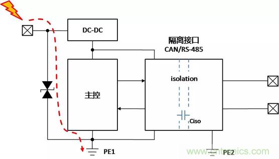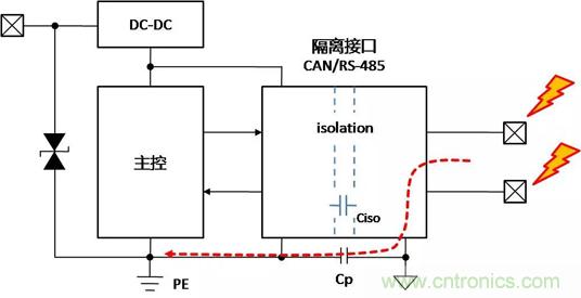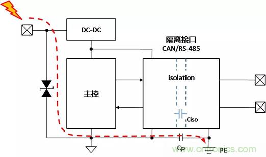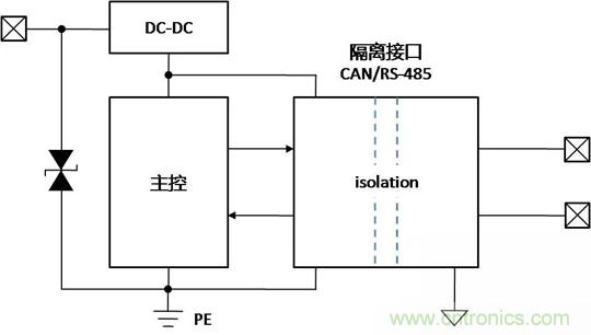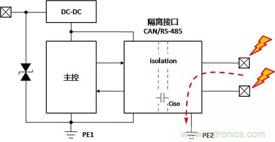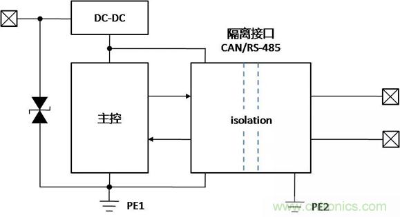 帶隔離通信接口的設(shè)備,在不同的使用、安裝狀態(tài)下,接口會表現(xiàn)出完全不同的ESD特性,了解設(shè)備在不同的使用狀態(tài)下,ESD對接口的影響的機理,才能有針對性地增加保護器件,提升隔離接口的ESD能力。下面以帶有隔離CAN或RS-485通信接口為例,對常見的設(shè)備狀態(tài)下,ESD的作用機理進行分析,并提出相應的改善措施。