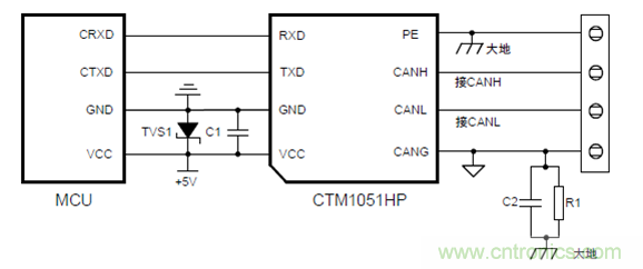 由于設(shè)備實際應用中會存在各種不同的狀態(tài),對于與上述描述不同的情況,也可按以上的方法進行分析,并有針對性的增加保護器件,從而達到提升ESD抗擾能力的作用。廣州致遠電子有限公司基于多年的總線防護設(shè)計積累推出了高防護等級隔離模塊——CTM1051(A)HP系列。該系列符合國際ISO11898-2標準,靜電防護等級可達接觸±8kV,空氣放電±15kV,浪涌防護可達±4kV隔離CAN解決方案,具體如下圖15所示,能夠適用于各種惡劣的工業(yè)現(xiàn)場環(huán)境。應用簡便,即插即用,應用原理圖如下圖16所示。