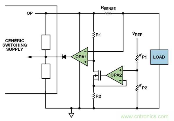 為了得到可變的電流,將基準(zhǔn)電壓——來自黑磚頭或本地——施加于P1 和P2 所代表的電位計。OPA2 和MOSFET通過R1 輸出小電流,在其上產(chǎn)生壓降。負(fù)載電流流過檢測電阻。若檢測電阻上的電壓由于負(fù)載電流超過R1 上的壓降而有所下降,那么OPA1 輸出將上升,覆蓋磚頭中的電壓控制,并限制其輸出電壓,防止輸出電流超過限值。
