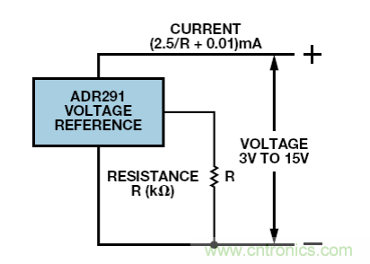 目前為止,我們討論的電路都是具有精密電流輸出的放大器。當(dāng)然,它們能夠與固定輸入一同使用,提供精密電流源,但構(gòu)建一個更簡單的雙端電流源也是可行的。低電流基準(zhǔn)電壓源ADR291 具有 10 μA左右的待機(jī)電流,典型溫度系數(shù)為 20nA/°C。如圖 11 所示,加入負(fù)載電阻后,則 3 V至 15 V電源范圍內(nèi)的基準(zhǔn)電流為(2.5/R + 0.01) mA,其中R為負(fù)載電阻,單位是kΩ。
