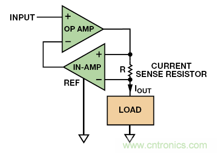 現(xiàn)在,高性能儀表放大器售價不高,因此使用一個運(yùn)算放大器、一個儀表放大器和一個電流檢測電阻組成雙極性電流源極為方便,如圖 10 所示。這類電路比Howland電流泵要更為簡單,不依賴于電阻網(wǎng)絡(luò)(除了集成儀表放大器的那種),且電壓擺幅在每個電源的 500 mV以內(nèi)。