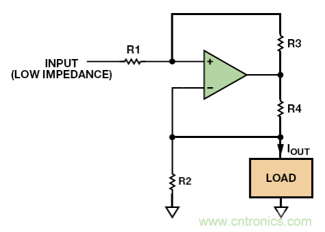 目前為止,我們討論的電路都是單極性的——電流在一個方向上流動——但雙極性電流電路也是可行的。最簡單、使用最廣泛的當(dāng)數(shù)Howland電流泵,如圖 9 所示。這款簡單的電路有很多問題:它對電阻匹配的精度要求極高,以獲得高輸出阻抗;輸入源阻抗會增加R1 電阻,因此它的數(shù)值必須非常低以最大程度降低匹配誤差;電源電壓必須比最大輸出電壓高得多;并且運(yùn)算放大器的CMRR性能必須相對良好。