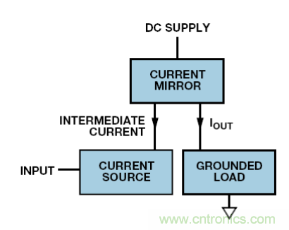 若電流或電壓輸入?yún)⒖嫉?,則必須使用電平轉(zhuǎn)換。有多個電路可以實現(xiàn);而圖 8 中的系統(tǒng)在很多場合下都適用。這款簡單的電路采用接地電流源驅(qū)動直流電源上的電流鏡,從而驅(qū)動負(fù)載。注意,電流鏡可能有增益,因此信號電流不需要像負(fù)載電流那么高。