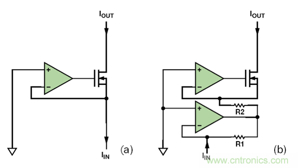 電流鏡具有相對較高、有時非線性的輸入阻抗,因此它們必須由高阻抗電流源(有時亦稱為剛性電流源)提供電流。若輸入電流必須具有低阻抗吸電流能力,則需使用運(yùn)算放大器。圖 6所示為兩個低ZIN電流鏡。