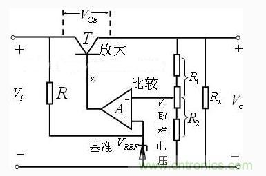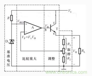 VI是整流濾波后的電壓,T為調整管,A為比較放大電路,VREF為基準電壓,它由穩(wěn)壓管Dz與限流電阻R構成。R1與R2組成反饋網絡,是用來反映輸出電壓變化的取樣環(huán)節(jié)。