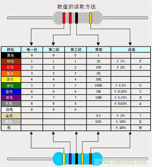黑-0、棕-1、紅-2、橙-3、黃-4、綠-5、藍(lán)-6、紫-7、灰-8、白-9、金-±5%、銀-±10%、無色-±20%