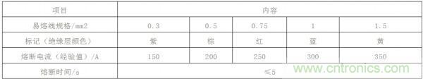 易熔線應(yīng)有明顯的標(biāo)志,當(dāng)其熔斷后,其標(biāo)志仍應(yīng)存在以便于更換。易熔線的熔斷特性如表1所示。