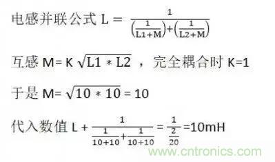 注意 N 有平方的,一組線圈的圈數(shù)是N, 則兩組線圈的圈數(shù)是 2N,將2N代入到公式中分子有 4N², 也就是說電感量為 4 倍。本例則為 40 mH。