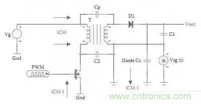 共模干擾由MOS管的高di/dt引起,經(jīng)過變壓器間的電容Cp或雜散電容C2傳到副邊,以Cp為主,C2基本可忽略。我們知道Cp很小,因此能傳到副邊的干擾頻率一定很高,低頻干擾信號過不去,因此EMI測試中的高頻部分基本就是共模干擾。究竟多少MHz與變壓器的結(jié)構有很大的關系,層間電容大了則可能1MHz的共模能過去,層間電容小了,則只能是更高的頻率能過去,比如5MHz以上。