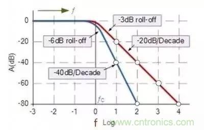 圖中橫坐標是頻率,用對數(shù)表示,縱坐標表示增益,單位為dB,注意圖中的圓點處,右面一條是一階濾波器的衰減曲線,圓點從1 到 2 頻率增加了十倍,從縱坐標中可以看到增益下降了20dB,通常稱為10倍頻程衰減20dB,左面一條曲線是二階濾波器,不難看出10倍頻程衰減40dB。