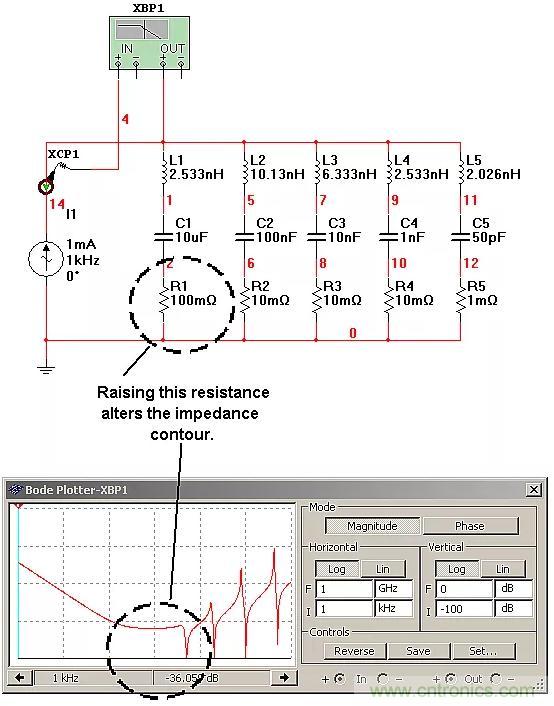 5個阻抗零點和4個阻抗峰值都受到電阻值的影響,圖3提供了一個范例。請注意,并聯(lián)諧振頻率本身不能完全消除,將永遠存在,你必須考慮到這一點。