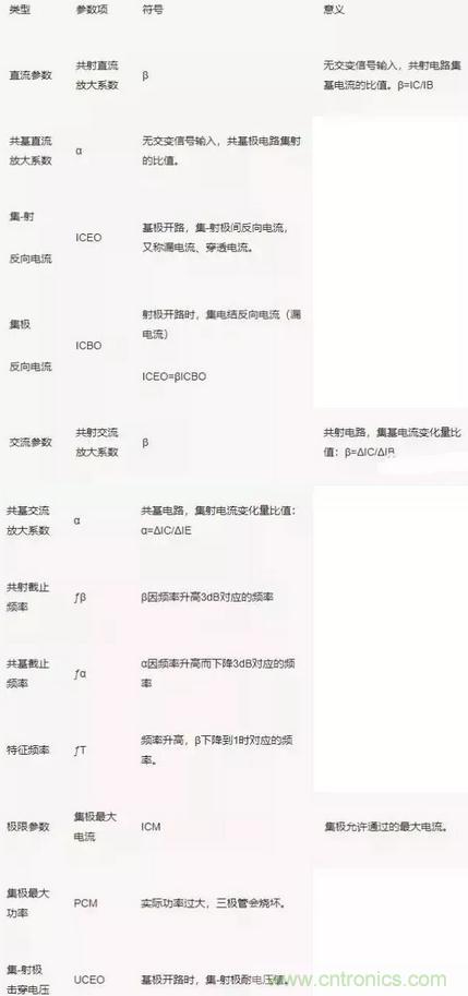 三極管性能參數(shù)較多,有直流、交流和極限參數(shù)之分:
