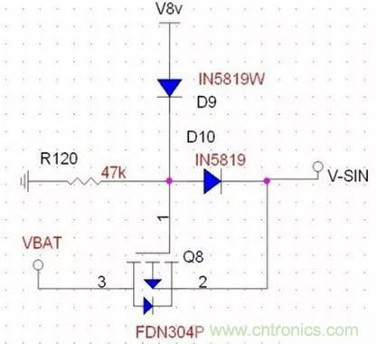 由PMOS來進(jìn)行電壓的選擇,當(dāng)V8V存在時,此時電壓全部由V8V提供,將PMOS關(guān)閉,VBAT不提供電壓給VSIN,而當(dāng)V8V為低時,VSIN由8V供電。注意R120的接地,該電阻能將柵極電壓穩(wěn)定地拉低,確保PMOS的正常開啟,這也是前文所描述的柵極高阻抗所帶來的狀態(tài)隱患。D9和D10的作用在于防止電壓的倒灌。D9可以省略。這里要注意到實際上該電路的DS接反,這樣由附生二極管導(dǎo)通導(dǎo)致了開關(guān)管的功能不能達(dá)到,實際應(yīng)用要注意。