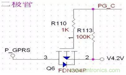 來看這個電路,控制信號PGC控制V4.2是否給P_GPRS供電。此電路中,源漏兩端沒有接反,R110與R113存在的意義在于R110控制柵極電流不至于過大,R113控制柵極的常態(tài),將R113上拉為高,截至PMOS,同時也可以看作是對控制信號的上拉。當(dāng)MCU內(nèi)部管腳并沒有上拉時,即輸出為開漏時,并不能驅(qū)動PMOS關(guān)閉,此時,就需要外部電壓給予的上拉,所以電阻R113起到了兩個作用。R110可以更小,到100歐姆也可。