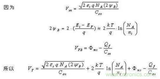 當(dāng)溫度T升高時,半導(dǎo)體Fermi能級將趨向于禁帶中央變化,則半導(dǎo)體Fermi勢ψB減小,從而導(dǎo)致更加容易達(dá)到ψs≥2ψB的反型層產(chǎn)生條件,所以閾值電壓降低。