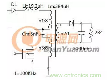 假設(shè)初級線圈耦合的比較好可以去掉原D1二極管,因漏感和電容會發(fā)生震蕩所以把D1串入到輸入端只為方便觀察波形。在有的應(yīng)用中反而要加大這個LC震蕩,比如QR模式的軟開關(guān)。