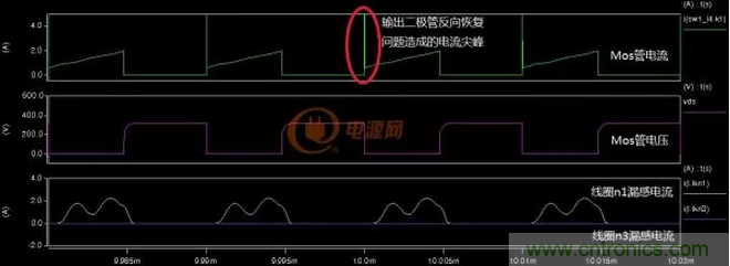 其次反激變壓器在連續(xù)模式下其輸出二極管有反向恢復(fù)問題,見下圖: