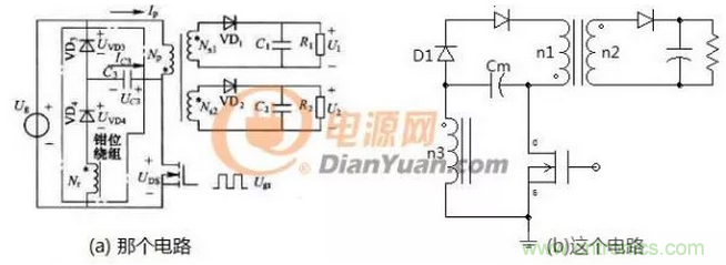 有一篇叫做“反激變換器繞組鉗位電路的設(shè)計與分析”的文章與這里的電路非常的相似。那個電路所具有的優(yōu)點也是這個電路的優(yōu)點,從而驗證了之前的理論和仿真結(jié)果。不過這里的電路有著更優(yōu)異的特點,見下面兩個電路對比圖: