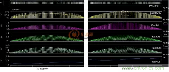 上圖中(a)普通反激電路Vds有尖峰電壓這是漏感造成的,圖(b)無損吸收則沒有這個電壓尖峰,而且只用了18nF的電容。兩種電路都采用的是臨界模式控制,輸入電流、輸出電流都是斷續(xù)的,輸出電壓上疊加有工頻紋波。