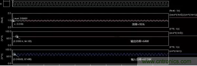 仿真的電路中二極管管壓降為0.3V元器件直流阻抗1m歐,忽略開關(guān)損耗及磁芯損耗,從仿真結(jié)果看效率可以達(dá)到95%左右。