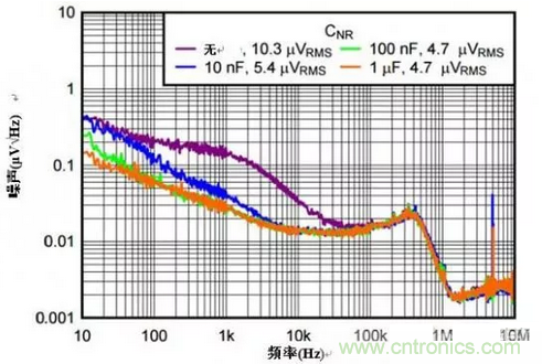 為該引腳添加一個電容器(CNR/SS),就可以形成具有內(nèi)部電阻的RC濾波器,有助于把由參考電壓生成的無用噪聲分流。由于參考電壓是噪聲的主要來源,增加電容可推送左側(cè)低通濾波器的截止頻率。圖 4 顯示了該電容器對輸出噪聲的作用結(jié)果。