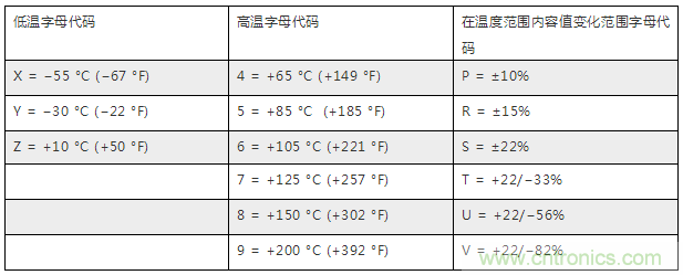 舉個(gè)列子,一個(gè)代碼為Z5U的電容工作溫度范圍為+10°C 到 +85 °C,容差為+22% 到 -56%;一個(gè)X7R的電容的工作溫度為-55°C 到 +125 °C,容差為±15%。
