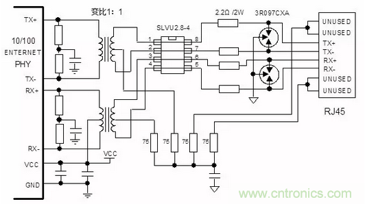 注意,TVS管的寄生電容可能影響信號(hào)完整性,可以使用壓敏電阻放在變壓器抽頭,作為防護(hù)電路,支持更高速率的網(wǎng)口設(shè)計(jì)。