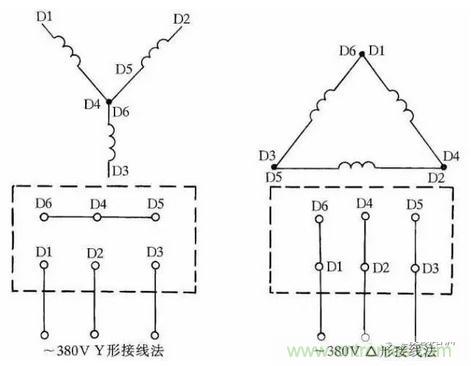 一般常用三相交流電動機接線架上都引出6個接線柱,當(dāng)電動機銘牌上標(biāo)為Y形接法時,D6、D4、D5相連接,D1~D3接電源;為△形接法時,D6與D1連接,D4與D2連接,D5與D3連接,然后D1~D3接電源??蓞⒁妶D1所示連接方法連接。