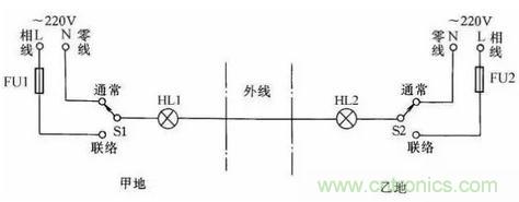 在某些生產(chǎn)過程中,需要兩地的生產(chǎn)人員能傳遞簡單的信息,以協(xié)調(diào)工作。圖22所示是用一根導線傳遞聯(lián)絡信號線路。兩地中各有一只雙擲開關控制信號燈聯(lián)絡,信號燈分別裝在兩地,一地一個。當甲地向乙地發(fā)聯(lián)絡信號時,撥動開關S1,乙地的指示燈亮,待乙地完成甲地所指示的任務后,乙地可把開關撥至“聯(lián)絡”位置,通知甲地工作已完成。