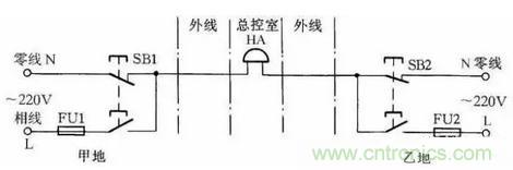 圖23所示線路可使甲乙兩地都能向總控制室發(fā)聯(lián)絡信號。當甲地向總控制室發(fā)信號時,按下按鈕SB1,控制室的電鈴告警。同理當乙地向總控制室發(fā)信號時按下SB2即可。甲乙兩地信號可用信號鈴聲的時間長短或次數(shù)區(qū)分。