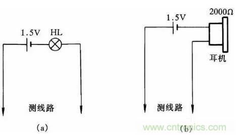 圖27(a)、(b)是最簡便的線路通斷檢測器。當測得導線通路時,燈泡會發(fā)光,耳機在通斷瞬時會發(fā)響;當線路斷路時,耳機不響,燈泡不亮。這種方法簡單易行,非常適合初學電工制作工具儀表或代替萬用表做測量,其優(yōu)點是攜帶方便。