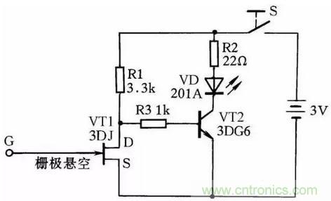 圖28所示是一感應測電筆線路。它可方便地測出導線的斷芯位置。在用來測導線斷芯位置時,在導線一端接上220V的電源相線,然后用感應測電筆的探頭柵極靠近被測導線,并沿線移動。如果發(fā)光二極管在移動中突然熄滅,那么此處便是導線斷芯位置。