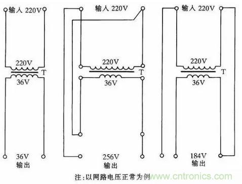 圖中的黑圓點表示繞組的同名端。如果將初、次級的連接線改為同名端相連;則輸出電壓將降低6.3V。采用這種接法;負載電流不得大于初、次級的額定電流。網(wǎng)路電壓如經(jīng)常比220V低(或高)30~40V;可選220V/36V的變壓器連接。