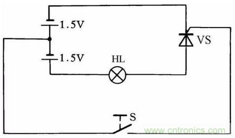 利用圖30所示的簡便方法可檢查晶閘管的好壞。當開關S斷開時燈泡不亮,而當開關S閉合后燈泡發(fā)亮,說明晶閘管能導通工作,否則晶閘管就是壞的。此方法對一般晶閘管均能測試,燈泡選用1.5V小電珠燈泡。