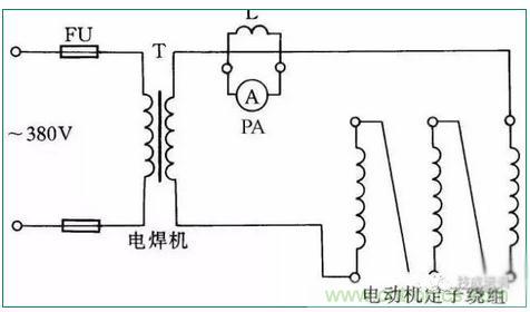 如果電動機受潮,而體積又較大,很不容易拆下放在烘箱內(nèi)干燥??蓪㈦姾笝C低壓電通入電動機三相繞組,用電流升溫干燥電動機。此方法適用于干燥20~60kW的電動機,電焊機的容量應根據(jù)電動機容量而選用。