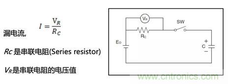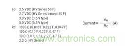 除了部份生產(chǎn)商直接提供參數(shù)值外,“漏電流值”可通過(guò)向超級(jí)電容器施加電壓直至特定時(shí)間后測(cè)量電阻器兩端的電壓,再根據(jù)以下簡(jiǎn)單方程計(jì)算便能得出。