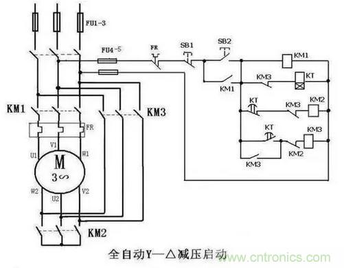 帶延時繼電器的星三角更加方便,接線和上圖的手動控制類似,只不過把按鈕開關(guān)換成了延時繼電器。按鈕開關(guān)SB2按下去以后KM1自鎖,同時延時繼電器的線圈得電啟動,延時繼電器KT常閉點串KM2線圈,KT常開點串KM3線圈,延時時間到了以后KM3自鎖。KM3的輔助常閉點串延時繼電器的線圈,所以啟動完成后,延時繼電器也會斷電。