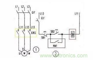 上圖是用接觸器控制電機的原理圖,圖1是主回路,圖2是控制回路,圖中黃色框內(nèi)就是接觸器的主觸點,藍色框內(nèi)是接觸器的輔助觸點,紅色框內(nèi)是接觸器的線圈。SB2是起動按鈕,SB1是停止按鈕,當按下SB2時KM1線圈得電吸合,同時藍色框內(nèi)的KM1輔助觸點也閉合,松開SB2電機照常轉動,按下SB1時電機停止。下圖時交流接觸器接線圖,可以與上圖對照一下。