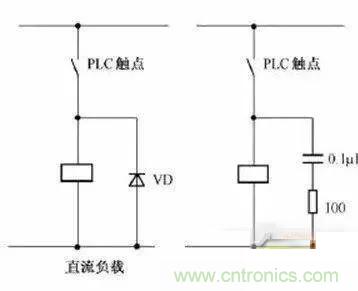當PLC輸入輸出端接有感性負載元件時,直流輸出的續(xù)流管保護(直流電路兩端并聯(lián)續(xù)流二極管),交流輸出阻容吸收電路。