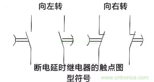斷電延時(shí)時(shí)間繼電器的觸點(diǎn)也是看圓弧,通電后觸點(diǎn)動(dòng)作。斷電后,圓弧向圓心方向移動(dòng),帶動(dòng)觸點(diǎn)延時(shí)復(fù)位。