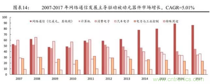 從被動(dòng)元件的發(fā)展歷程來(lái)看,近些年來(lái),產(chǎn)業(yè)鏈下游的需求擴(kuò)大主導(dǎo)著被動(dòng)元件市場(chǎng)的擴(kuò)張。金融危機(jī)以來(lái),全球電子元件市場(chǎng)規(guī)模的增長(zhǎng)主要來(lái)自于網(wǎng)絡(luò)通信與汽車電子,尤其是智能手機(jī)。