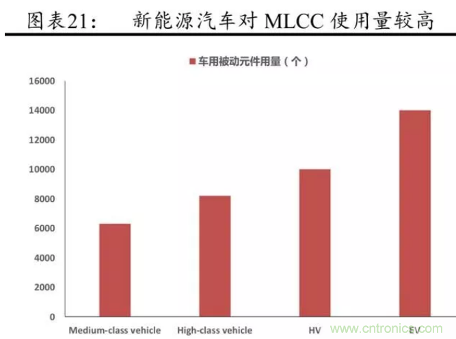 電動(dòng)汽車對(duì) MLCC 元件的需求量巨大,其中動(dòng)力系統(tǒng)帶來(lái)的MLCC增量較為顯著。據(jù)前瞻研究院的數(shù)據(jù),每輛汽車使用的電子元件,中端車平均為 6300 個(gè),高端車為 8200 個(gè),純電動(dòng)汽車增加到14000個(gè),其中有一半是 MLCC,這意味著隨著新能源汽車的不斷普及,MLCC 需求量會(huì)不斷增長(zhǎng)。