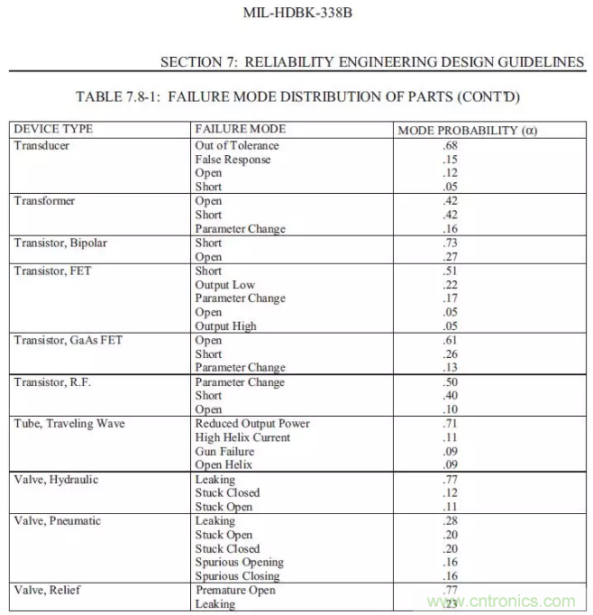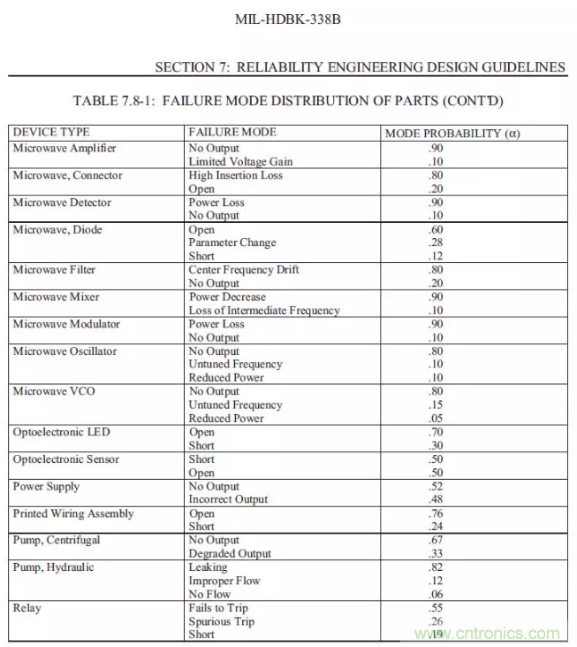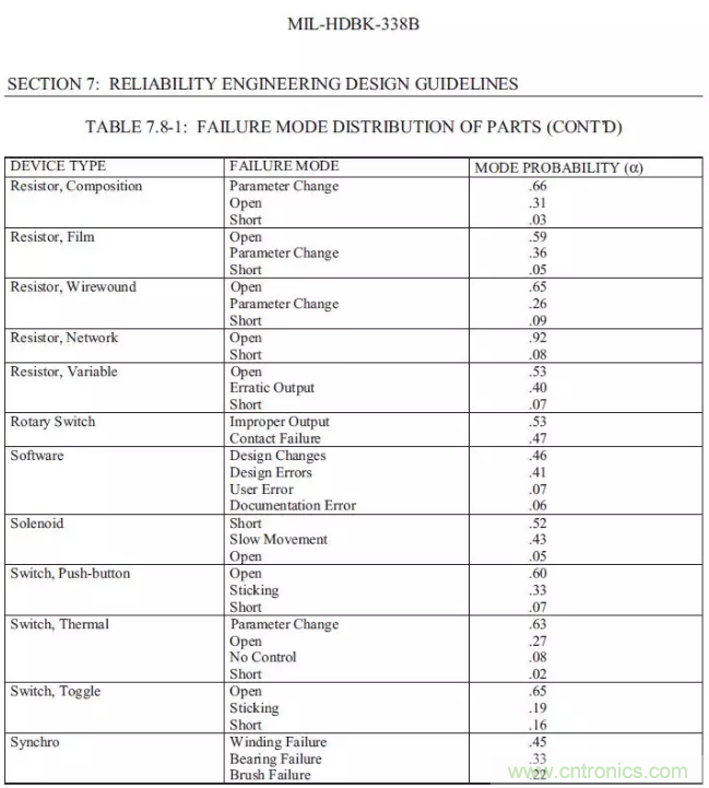 【導(dǎo)讀】以下總結(jié)摘錄MIL-HDBK-338B,美軍可靠性設(shè)計手冊來為FTA(故障樹)做一些支持。如果我們想要進行FTA的定量分析,一定要把可靠性預(yù)測先做完,在可靠性前一定要把電壓分布表和溫度分布先進行初步的運算,通過下面的的表格,大概可以預(yù)計失效發(fā)生的時候故障的分配比例。