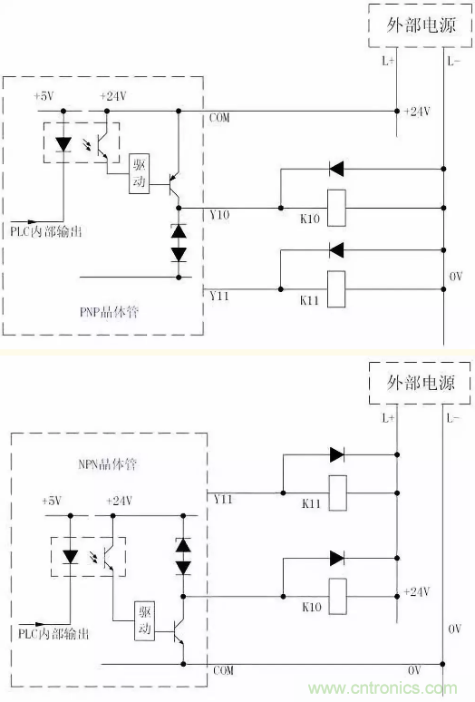 由以上兩圖可看出這兩種晶體管輸出電路形式的區(qū)別:NPN型集電極開路輸出形式的公共端COM只能接外接電源的負(fù)極,而PNP型的COM端只能接外接電源的正極。