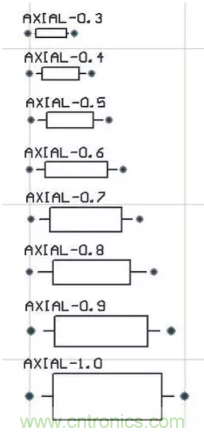 可以選用“RES1”、“RES2”、“RES3”、“RES4”中任何一個,對應的電阻封裝為AXIAL系列,比如“AXIAL-0.3”到“AXIAL-0.7”,其中0.4和0.7指電阻封裝的焊盤間距,一般用“AXIAL0.4”封裝。