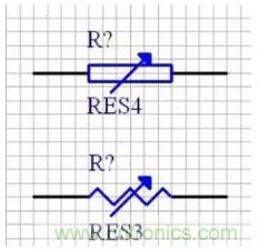電阻的種類繁多,通常分為固定電阻、可變電阻和特種電阻3大類。固定電阻可按電阻的材料、結構形狀及用途等進行多種分類。電阻的種類雖多,但常用的電阻類型主要為RT型碳膜電阻、RJ型金屬膜電阻、RX型線繞電阻和片狀電阻等。固定電阻的原理圖符號的常用名稱是“RES1”和“RES2”,如圖F1-5(a)所示。