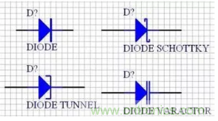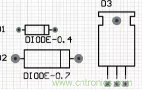 二極管的原理圖符號為“DIODE”,對應的二極管的封裝為封裝屬性系列,如“DIODE-0.4”(小功率)到“DIODE-0.7”(大功率),其中0.4和0.7指二極管的焊盤間距,一般用“DIODE0.4”。值得一提的是,普通的發(fā)光二極管的元器件封裝為“RB.1/.2”。