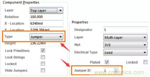 1.要設(shè)置為跳線的組件類(lèi)型。2.跨接導(dǎo)線組件中的兩個(gè)極板的跳線ID設(shè)置為相同的非零值。注:一旦設(shè)置了組件類(lèi)型和襯墊跳轉(zhuǎn)屬性,組件就會(huì)表現(xiàn)為跳線器。