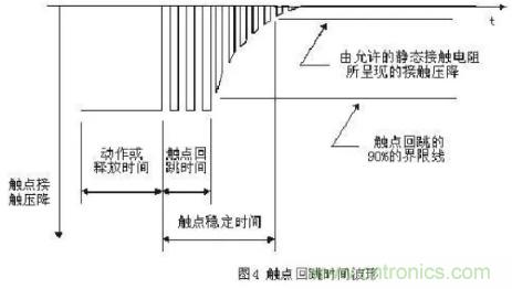 回跳時(shí)間包括吸合回跳時(shí)間和釋放回跳時(shí)間。由于繼電器是采用有彈性的機(jī)械觸點(diǎn)完成線路的接通和斷開(kāi),因此不同于由半導(dǎo)體器件組成的無(wú)觸點(diǎn)電子開(kāi)關(guān),當(dāng)繼電器的觸點(diǎn)接通或斷開(kāi)的瞬間會(huì)有一段不穩(wěn)定的接觸期,典型的觸點(diǎn)波形見(jiàn)圖4。